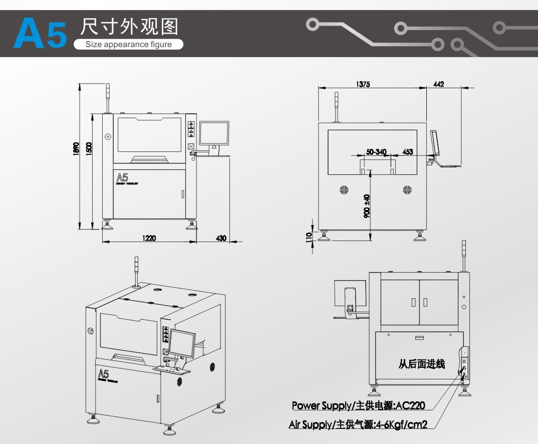A5系列是一款高精度全自動錫膏印刷機(High?PrecisionAuto?Paste?Printer)。在表面組裝工藝生產(chǎn)(SMT)中,用于高精度的鋼網(wǎng)印刷或漏版印刷的專用生產(chǎn)設備。