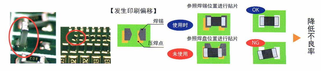 通過貼片機(jī)內(nèi)的OCC相機(jī),識別出焊錫印刷的位置偏移,參照焊錫位置補(bǔ)正貼片坐標(biāo)位置,降低了因焊錫印刷位置偏