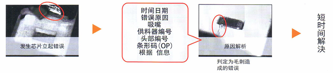過在貼片頭部內(nèi)安裝超小型攝相機(jī),可以實(shí)時(shí)取得吸取/貼片的圖像,實(shí)現(xiàn)了吸取與貼片時(shí)的檢查,還能保存追溯信息。